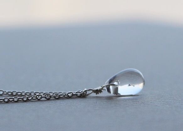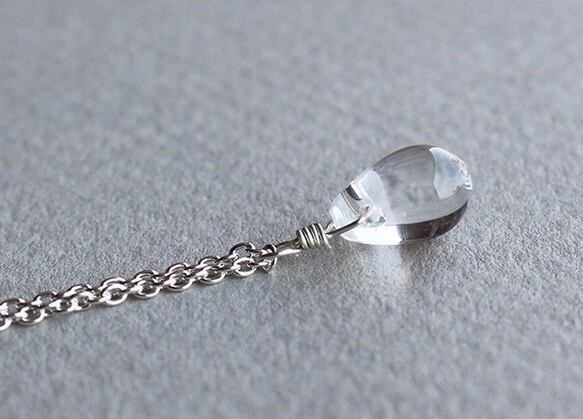 本物の水滴のように透き通ったドロップカットのクォーツ(水晶)を使った、とても涼しげなネックレスです。