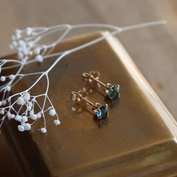 11月の誕生石で、深みのあるネイビーが印象的なロンドンブルートパーズをシンプルなスタッドピアスにしました。